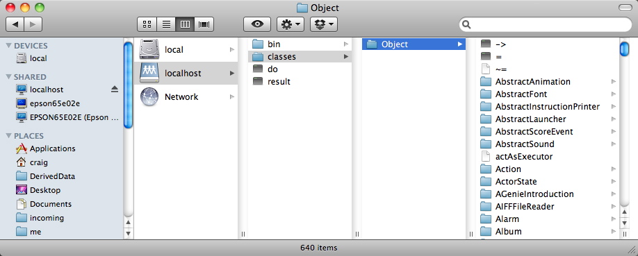 I’m writing WebDAV support for Spoon. One way to interact with Spoon (before one realizes what else is possible :) is to mount its virtual filesystem from the host computer, then edit files within it using your favorite text editor. Spoon can present files which are semantically meaningful (a class hierarchy as a hierarchy of files, for example), and associate various meanings with changes to those files. By choosing that presentation wisely, one could create a complete development environment, operable from that favorite text editor.