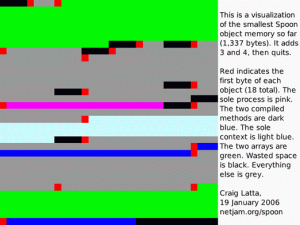 The smallest object memory snapshot I’ve made so far is 1,337 bytes long, on 19 January 2006. You can get the bits (also see my notes about the visualization tools). It adds 3 and 4, then quits.